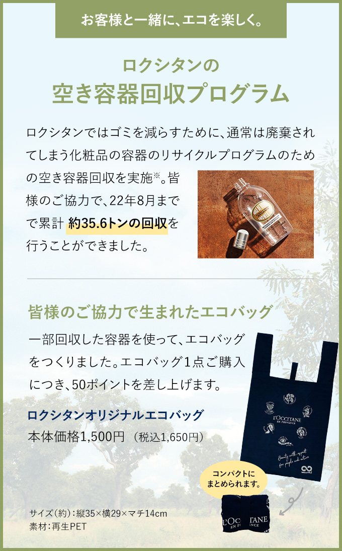 ※店頭でお引取りの場合 、ご予約製品のお買い上げ期間を過ぎた場合はご予約製品・プレゼントともにキャンセルとなりますので、予めご了承ください。 ※公式通販でご購入の際、プレゼントは先着順となります。在庫がある場合はカートに表示されますのでご確認ください。 ※プレゼントは数に限りがありますので、品切れの際はご容赦ください。お一人様1個までとさせていただきます。 ※プレゼントは1回のご注文につき対象金額以上お買い上げの方が対象となります。 ※各種、セルフラッピングキット、ペーパーバッグは、購入特典への累積購買金額の対象外とさせていただきます。 ※製品(単品・キット)、それらに付属するプレゼントやラッピング、予約特典・購入特典の内容及びデザイン・カラーは変更になる場合があります。 ※公式通販・オンラインショップではキャンペーンの内容およびプレゼント条件が異なる場合があります。 ※複数のプレゼントを受け取る際は、各プレゼントの条件金額の合計以上をご購入いただいた方が対象となります。但し、ポイントを利用した購入金額は各プレゼントの条件金額対象外です。詳しくは店頭でスタッフにお尋ねください。 ※ジェイアール名古屋タカシマヤ店1階「ル マルシェ バイ ロクシタン」、免税店、SPA、カフェ、アウトレットは対象外になります。 ※画像はイメージです。製品・小物はプレゼントに含まれません。 ※プレゼント対象外アイテムがある場合がございます。あらかじめご了承ください。